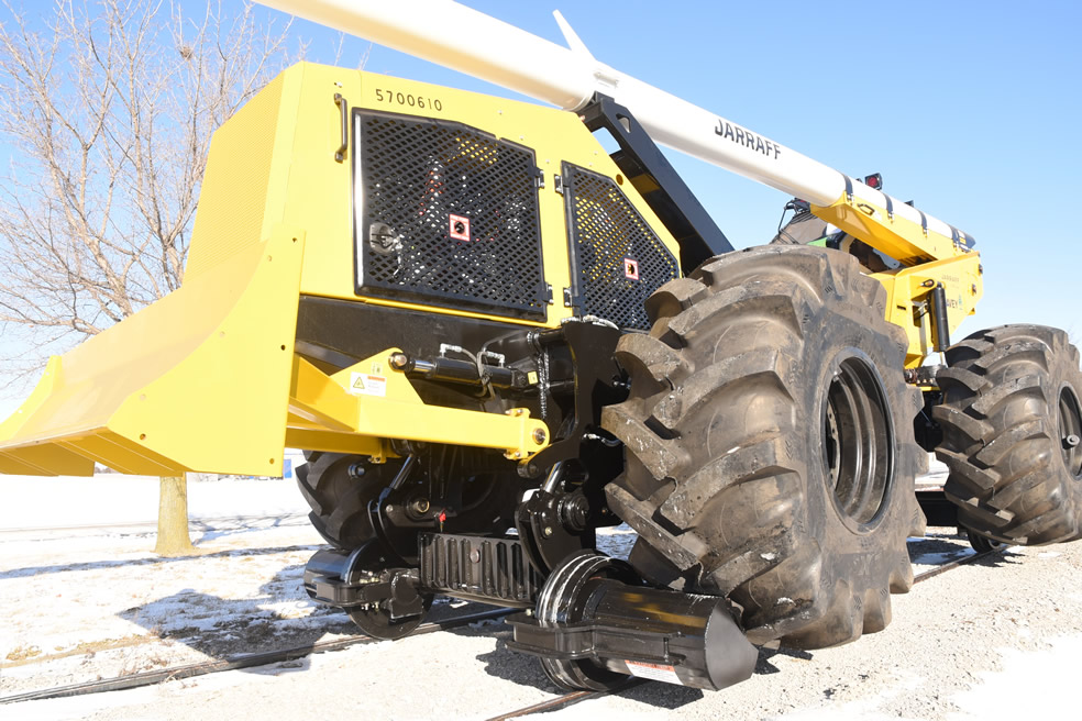 Discover the cutting-edge innovation of Mitchell Rail Gear's Friction Drive Hi-Rail system, designed specifically for Jarraff Tree Trimmers. This remarkable technology transforms these cranes into versatile dual-purpose machines capable of seamlessly transitioning between conventional on rubber tires tree trimming to on-railroad tracj tree trimming.